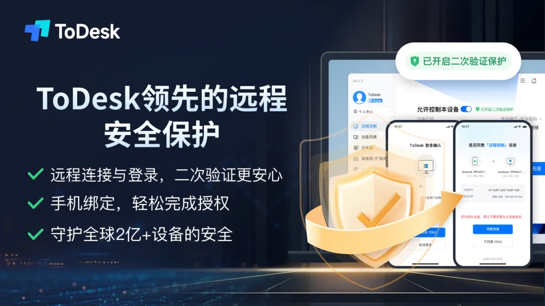 开启二次验证保护后,除了输入设备代码和密码,用户还需在绑定的手机主设备上二次验证连接,双重保障远控安全。