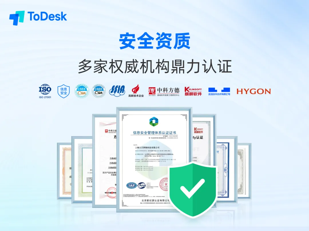 值得骄傲的是,ToDesk已获得ISO信息安全管理体系认证、ISO信息技术服务体系认证等多项权威资质认可。用户的每一次连接,都在国际标准的安全防护下进行。