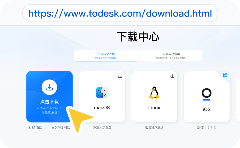 访问ToDesk官网,在您的所有设备(Win, macOS, Linux, iOS, Android...)上下载并安装对应的客户端。